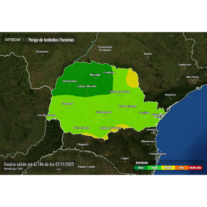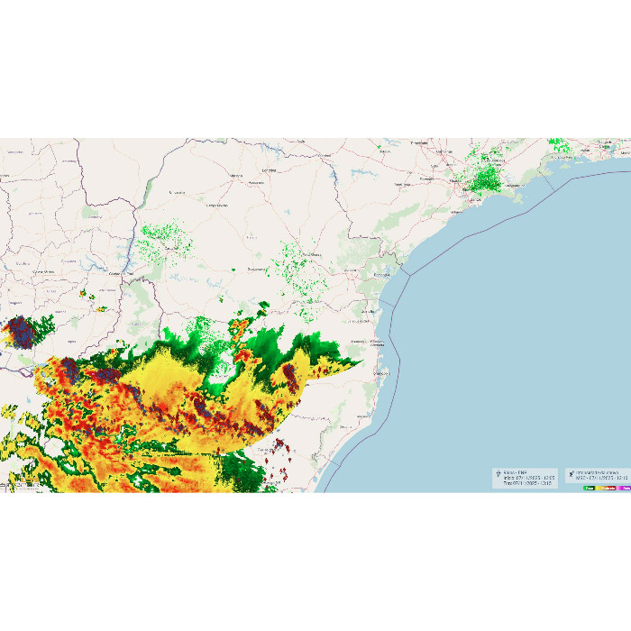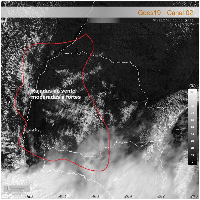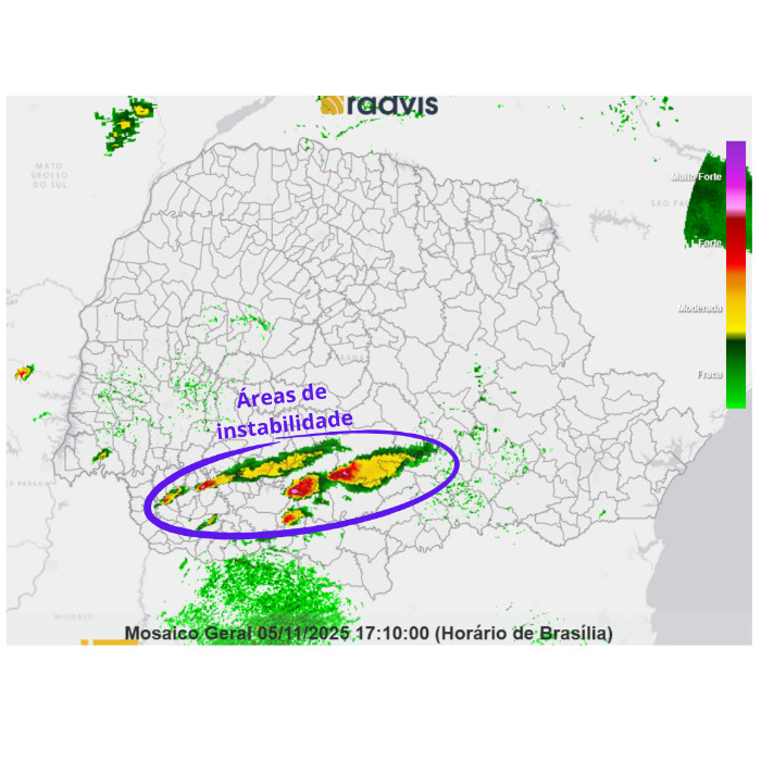 Durante a madrugada e início da manhã, fortes temporais atingiram o Paraná, com intensas rajadas de vento (a exemplo Guaíra, com 82,4 km/h e Altônia, com 91,8 km/h). Os maiores acumulados de chuva do período foram registrados em Altônia (37 mm) e Apucarana (33,8 mm). As instabilidades atuaram com maior intensidade em porções do noroeste e norte do Paraná, com grande atividade elétrica e rajadas de vento pontuais. Situação de tempo instável persiste na faixa norte, divisa com São Paulo, com baixa incidência de raios. Nas próximas horas, pancadas de chuva isoladas são esperadas na metade sul do estado, com baixo potencial para temporais.