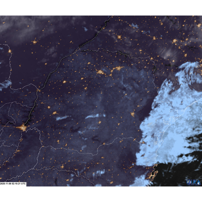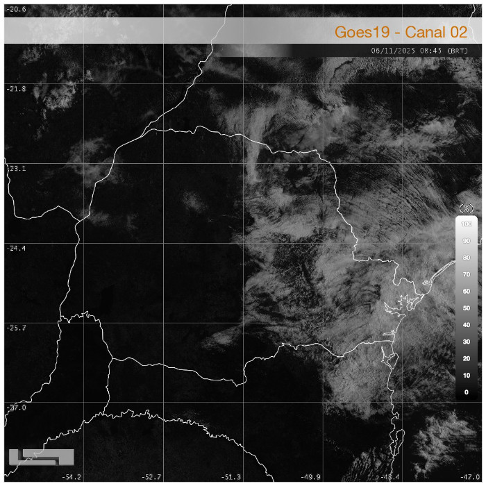 O estado do Paraná apresenta nebulosidade persistente na faixa leste, decorrente do avanço de umidade proveniente do oceano, impulsionada pela atuação de ventos de sudeste. Em contrapartida, nas regiões central e oeste, observa-se baixa cobertura de nuvens e predomínio de céu claro. Nessas áreas, as temperaturas tendem a se elevar ao longo do dia, favorecendo o aquecimento diurno. Já no setor leste, incluindo a Região Metropolitana de Curitiba e o Litoral, os valores de temperatura permanecem entre 16 °C e 18 °C, com baixa tendência de elevação durante a tarde.