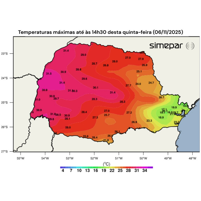 A instabilidade avança a partir do Rio Grande do Sul, onde já ocorrem chuvas com trovoadas, especialmente na metade sul do estado gaúcho. No Paraná, observa-se que a faixa oeste apresenta as temperaturas mais elevadas, com valores médios próximos de 22 °C, enquanto as temperaturas diminuem gradualmente em direção ao Sul e aos Campos Gerais, onde os valores são mais baixos, próximos de 11 °C.