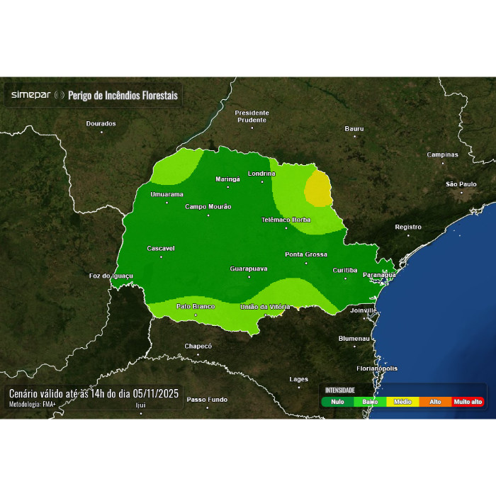 A atmosfera segue instável no Paraná, com pancadas de chuva e trovoadas nas diversas regiões. Se destacam municípios dos Campos Gerais e Norte Pioneiro neste momento, com temporais localizados. Com temperaturas em elevação, ultrapassando os 30 °C em muitos municípios, oferta de umidade e aumento dos ventos nos baixos níveis da atmosfera, o cenário se configurou para ocorrências no estado, agora isoladas. Nas próximas horas o tempo segue instável no estado, em especial sobre as porções mais ao norte, Campos Gerais e leste. Nos mapas a seguir, segue a condição de instabilidade no estado com o mosaico de radares do Simepar, além do risco de incêndios florestais válido até às 14h desta quarta-feira.