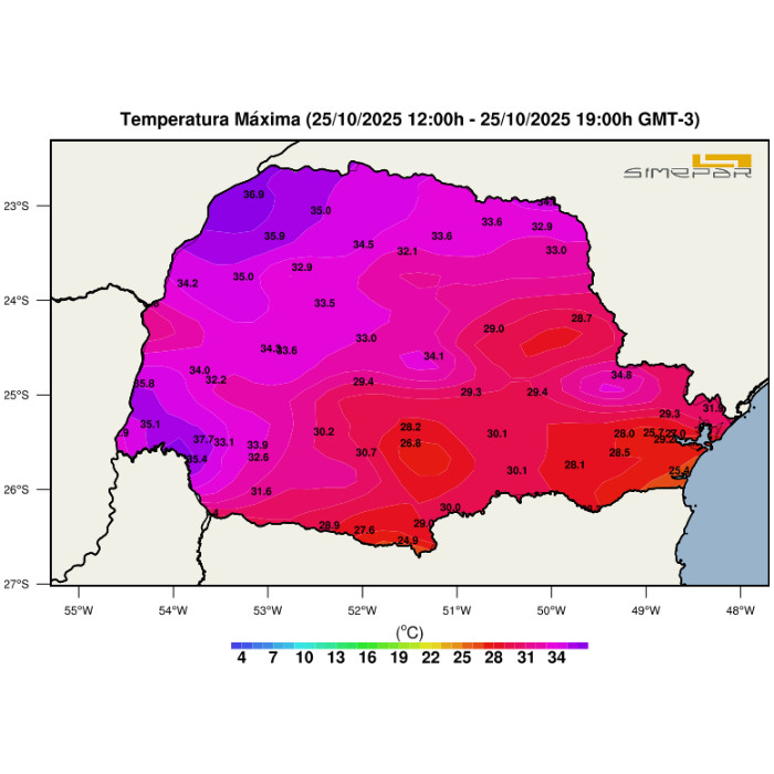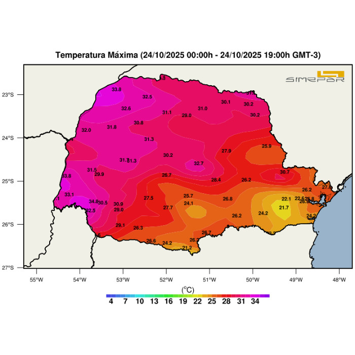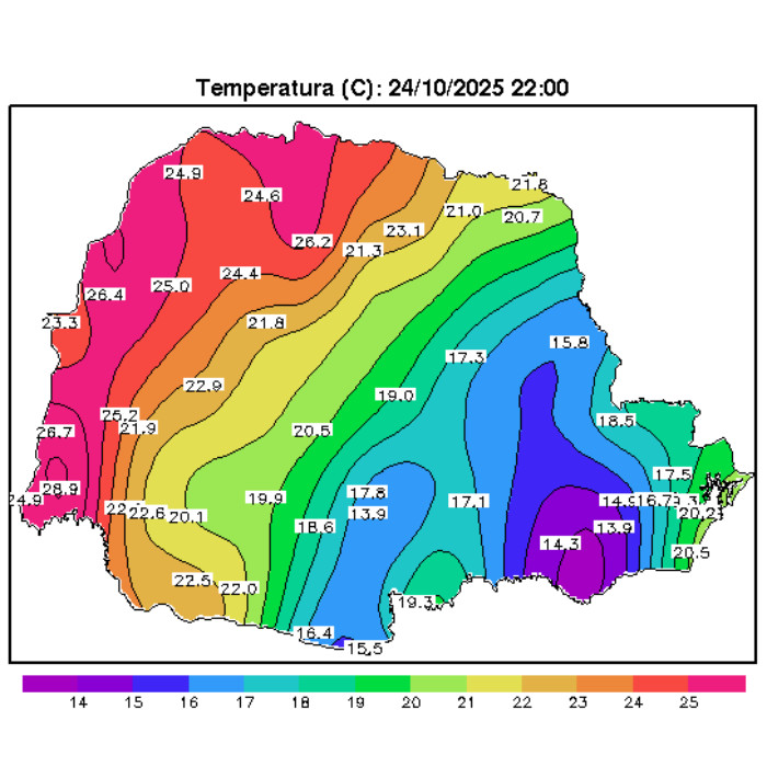 Com a massa de ar frio perdendo intensidade sobre o Paraná, as temperaturas se elevam cada vez mais nas diversas regiões, com destaque para as faixas oeste, noroeste e norte, nas quais as máximas ultrapassaram os 30 °C. Capanema (34,8 °C), Loanda (33,8 °C), Santa Helena (33,8 °C), São Miguel do Iguaçu (33,1 °C) registraram as maiores marcas desta sexta-feira. Na faixa leste o cenário também é de elevação nos termômetros: Curitiba registrou 22,8 °C, com 1,2 °C a mais em relação a quinta-feira (23/10). Lapa anotou 22,0 °C na quinta, e 24,2 °C hoje durante a tarde (2,2 °C de elevação). Os ventos ainda persistem sobre o estado, elevando a sensação de frio na manhã e no período da noite na faixa leste e sul,e já mudam de direção no interior, passando a predominar do quadrante norte (em especial da direção nordeste), numa situação pré-frontal.