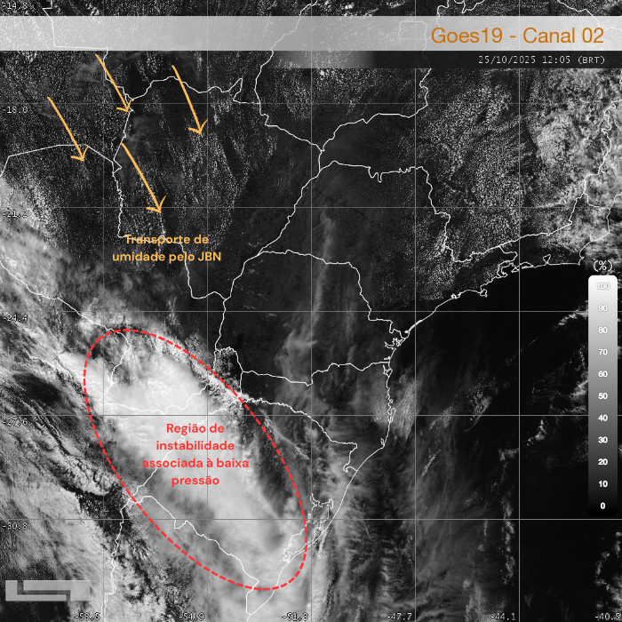 Na imagem a seguir, nota-se a presença de nuvens organizadas em faixas paralelas, estendendo-se da Bolívia em direção ao sul do Mato Grosso do Sul e Paraguai (destacadas pelas setas laranjas), alinhadas no sentido noroeste-sudeste. Essas formações indicam a atuação do Jato de Baixos Níveis (JBN), um escoamento de ar quente e úmido que ocorre em torno de 850 hPa, aproximadamente entre 1,5 e 1,7 km acima do solo. Nesse caso, o jato está intensificado pela presença de um sistema de baixa pressão próximo a região Sul do Brasil (área da elipse tracejada em vermelho), que favorece o aumento do gradiente de pressão e, consequentemente, acelera o escoamento de norte. Esse vento mais forte e organizado em baixos níveis canaliza a umidade amazônica para o Centro-Sul da América do Sul, formando as típicas 'ruas de nuvens' que evidenciam o caminho do ar úmido em direção às áreas mais instáveis.