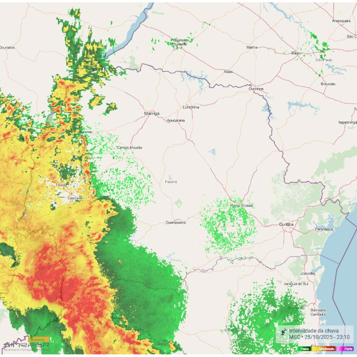 Chove no Paraná, desde os setores mais a oeste até áreas centrais do estado. A faixa de instabilidade se estende de norte a sul, conforme mostra a imagem ao lado, com dados de radar meteorológico. As chuvas variam de fraca a moderada intensidade, com alguns núcleos mais fortes acompanhados de descargas atmosféricas.