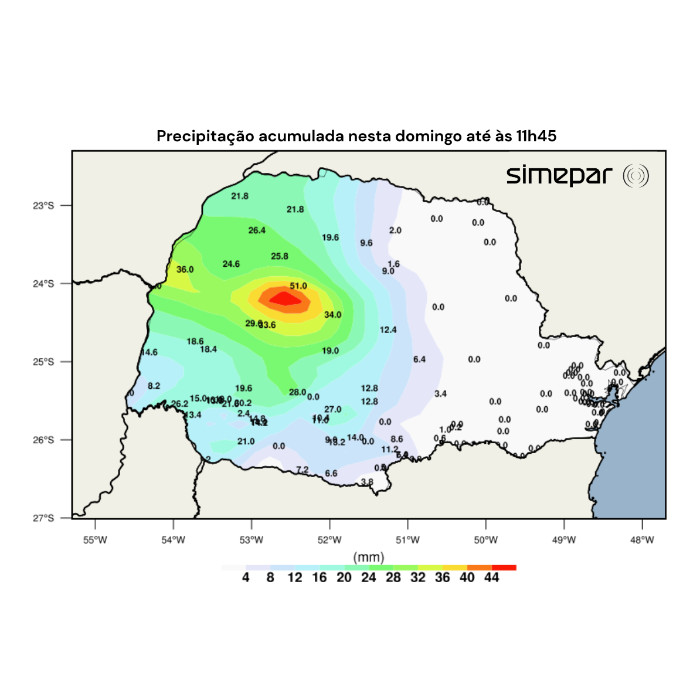 Ao longo da madrugada e da manhã de domingo, as chuvas ocorreram principalmente na metade oeste do Paraná, como é possível observar nos acumulados de precipitação apresentados na imagem a seguir, que indicam os maiores volumes nesta porção do estado. No decorrer da manhã, as instabilidades avançaram em direção ao leste do estado, atingindo os Campos Gerais, o Sudeste, o Norte e o Leste. No entanto, a precipitação foi perdendo intensidade à medida que se deslocava para essa direção. Até as 11h45, o maior acumulado de chuva foi registrado no município de Campo Mourão, com 51,0 mm.