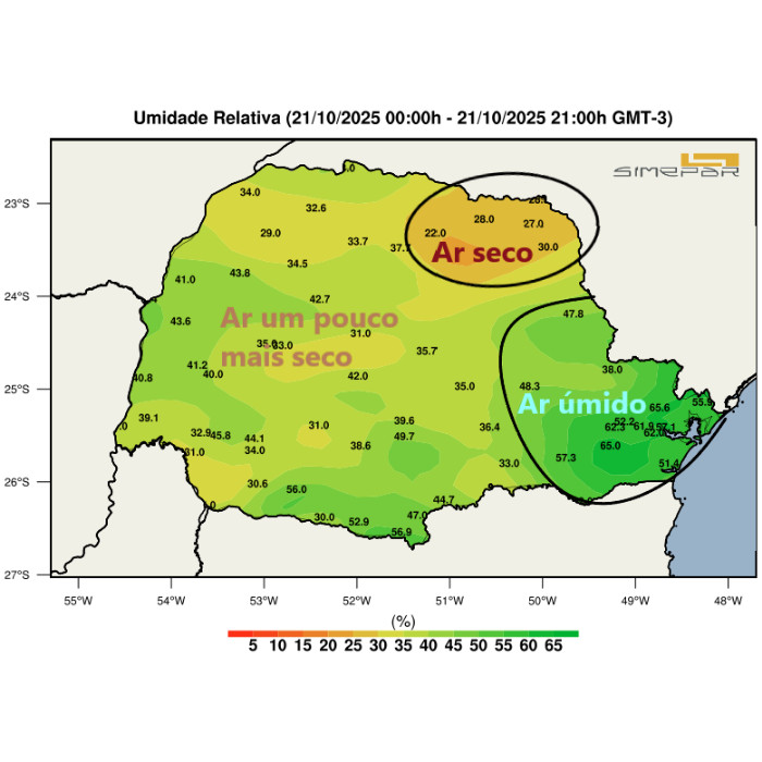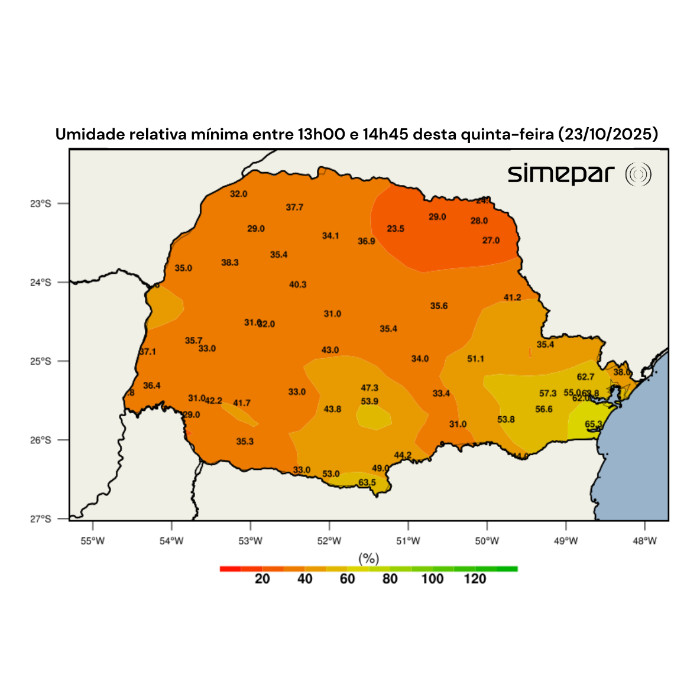 Nas metades norte e oeste, as temperaturas máximas desta tarde variam entre 27 °C e 31 °C, com a umidade relativa mínima oscilando entre 30% e 40%. Nas regiões Centro-Sul, Campos Gerais e Leste, as temperaturas estão menos elevadas e, consequentemente, os valores de umidade relativa do ar se mantêm mais altos. Nesta tarde, no Norte Pioneiro, registram-se os menores índices de umidade do estado, na casa dos 20%. A primeira imagem a seguir demonstra a distribuição da umidade relativa do ar no território paranaense.