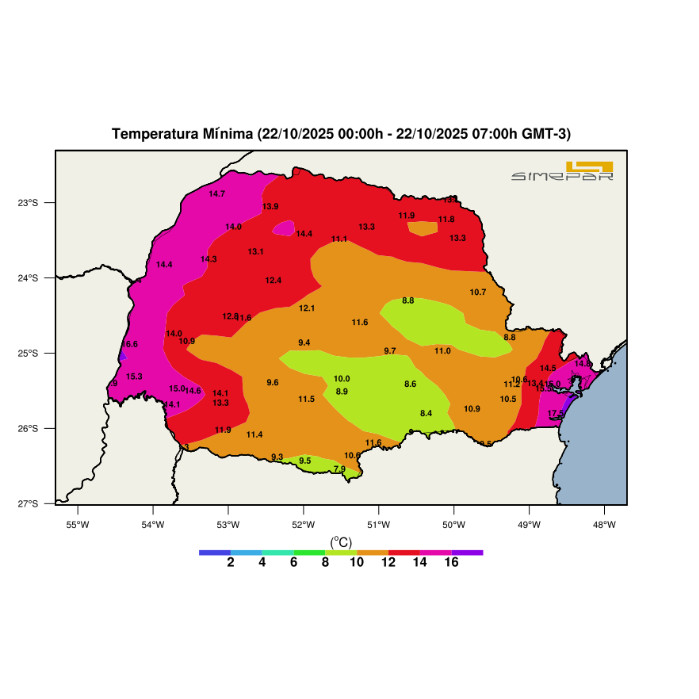 Mais uma madrugada de tempo estável em grande parte das regiões paranaenses. Apenas no leste, entre a RMC e as praias, há registros de chuvas fracas e isoladas. As temperaturas apresentam uma pequena elevação em relação ao começo da semana, mas no sul do estado, os termômetros seguem abaixo dos 10 ºC. O mapa mostra as temperaturas mínimas registradas pelas redes de estações meteorológicas do Simepar e Inmet, até às 04h.