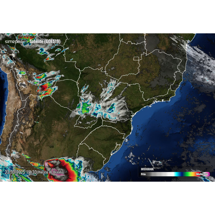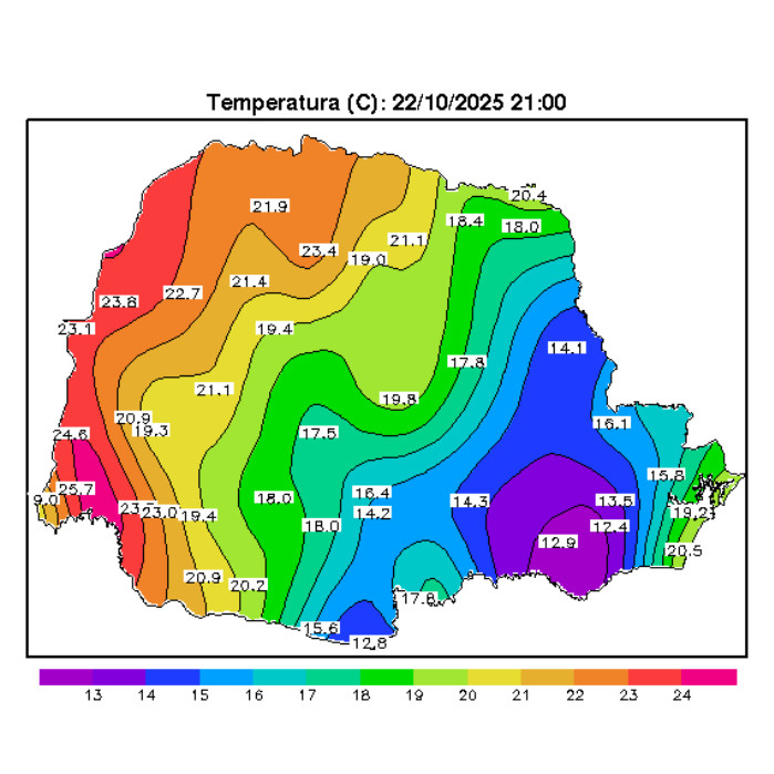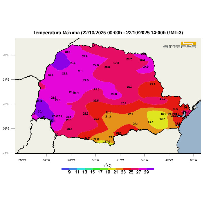 Predomina tempo estável na maior parte do Paraná, com poucas nuvens concentradas nas áreas mais a leste. Em relação às temperaturas, observam-se valores mais elevados a partir do oeste e noroeste, próximos dos 30 °C, conforme o mapa ao lado. A elevação térmica é mais lenta nos setores sul e nos Campos Gerais, onde as temperaturas variam entre 17 °C e 20 °C neste início de tarde.