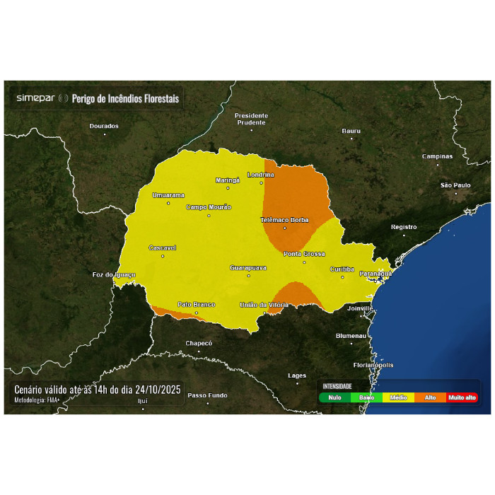 Noite de tempo estável em praticamente todo o Paraná. Apenas na faixa leste (RMC/litoral) há presença de nuvens, com garoa nos trechos de serra. Destaque para as baixas temperaturas observadas na RMC, com valores perto de 13°C (vento aumentando a sensação de frio). Entre o Oeste e o Noroeste as temperaturas estão acima dos 20°C em muitas cidades.