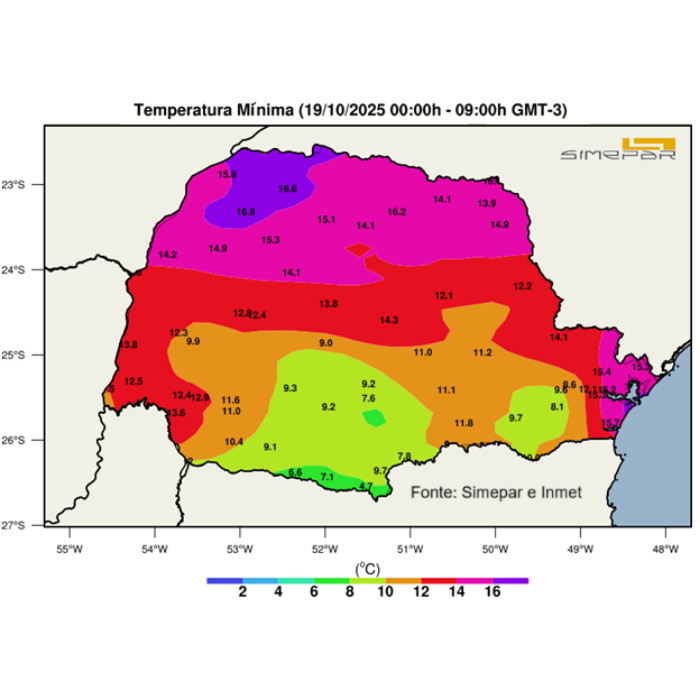 O sol predomina na maior parte do Paraná, embora haja alguma nebulosidade no leste do Estado, mas sem registro de chuvas. Em relação às temperaturas, o frio nas últimas horas foi mais significativo nas áreas ao sul do Paraná, com valores ligeiramente abaixo de 7 ºC. No mapa ao lado, estão representadas as temperaturas registradas na última hora, e não os menores valores do dia.