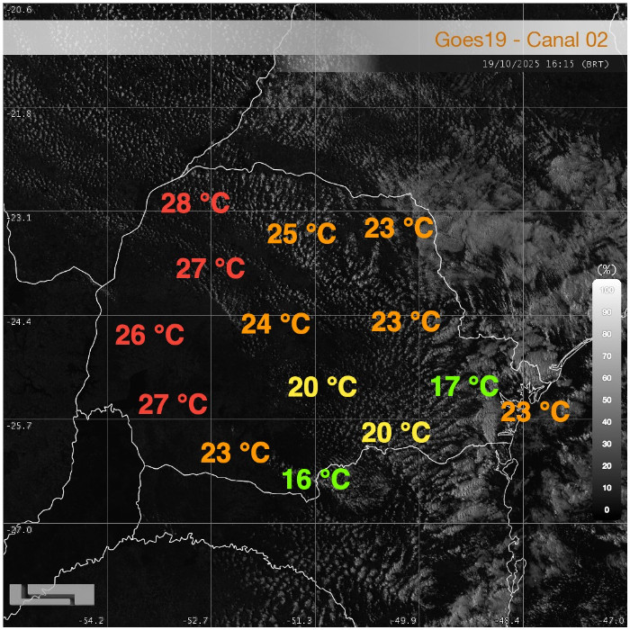 Sobre o Paraná, observa-se a presença de nebulosidade baixa em áreas da faixa norte, Sudeste, Campos Gerais e Leste. Chuva fraca e ocasional foi registrada por pluviômetros localizados próximos à divisa com o estado de São Paulo, no Norte Pioneiro e no Litoral Paranaense.