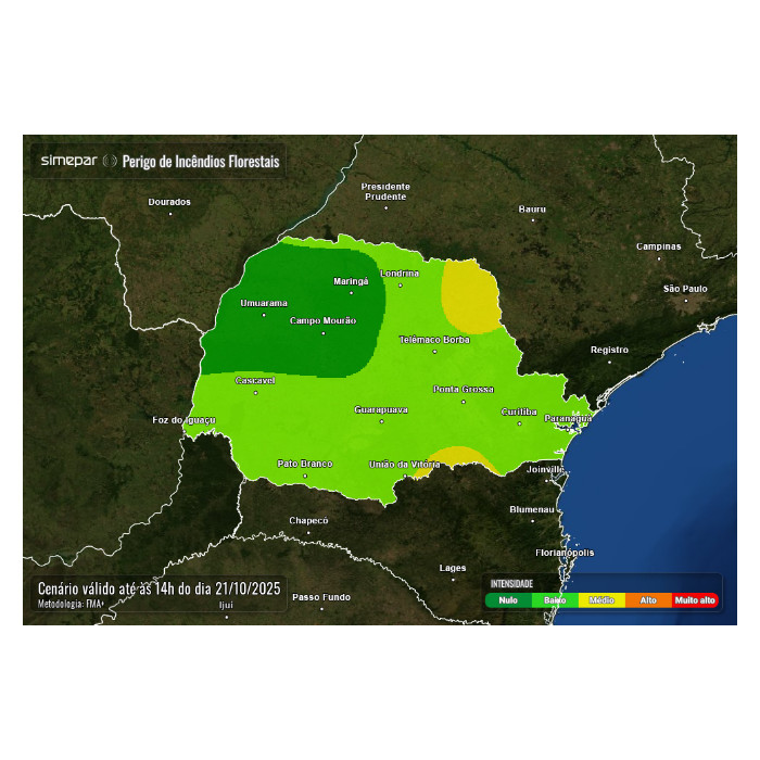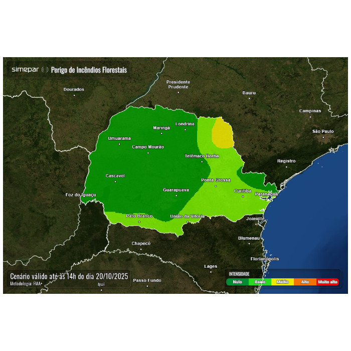 Risco de incêndios florestais para as próximas 24 horas está baixo na maior parte do Paraná.