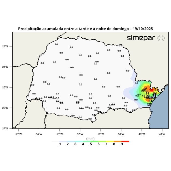 Em Curitiba, a chuva ocorreu ao final da noite, com fraca intensidade, acumulando 0,6 mm. Desse modo, os acumulados de chuva foram inferiores a 6,0 mm na região Leste, como pode ser observado na imagem a seguir.