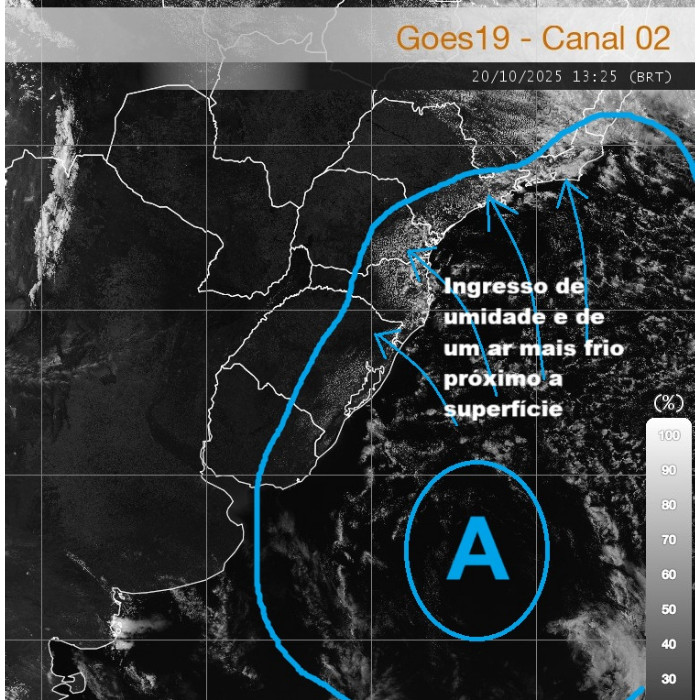 A presença de um sistema de alta pressão (letra A no mapa) sobre o oceano contribui para ingresso de umidade do oceano, por isso a nebulosidade está um pouco mais presente na faixa leste do estado nesta tarde de segunda-feira. Em alguns pontos há registro de garoa/chuva fraca. Além de umidade, este sistema favorece o ingresso de um ar mais frio, tanto que as temperaturas agora a tarde estão bem amenas entre o Centro-Sul, Campos Gerais e a RMC (abaixo dos 18°C). Vento ajuda a aumentar a sensação de frio. No Sudoeste, Oeste, Noroeste e Norte o sol predomina, com temperaturas mais agradáveis.
