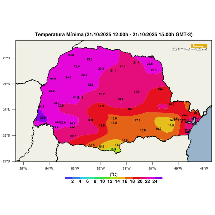Com a atuação de uma massa de ar frio e seco sobre o estado, o tempo estável volta a predominar nas diversas regiões paranaenses. O Sol aparece em todos os setores, de forma mais tímida no litoral e nas regiões que fazem divisa com São Paulo, como o Norte Pioneiro e os Campos Gerais. Nesses setores da faixa leste, chuviscos rápidos e ocasionais não estão descartados, aumentando no período da noite. Com o Sol dominando, as temperaturas se elevaram, ultrapassando a marca dos 20 °C em boa parte do Paraná. Destaques vão para Loanda (27,9 °C), Capanema (27,3 °C) e Cidade Gaúcha (27,1 °C). No Sul e na RMC as máximas ficaram ao redor ou abaixo dos 20 °C nos termômetros. Nas imagens em anexo, seguem o mapa com a distribuição espacial das temperaturas máximas registradas nesta tarde de domingo, e o mapa com o risco para incêndios florestais, válido até às 14h desta segunda-feira (20/10).