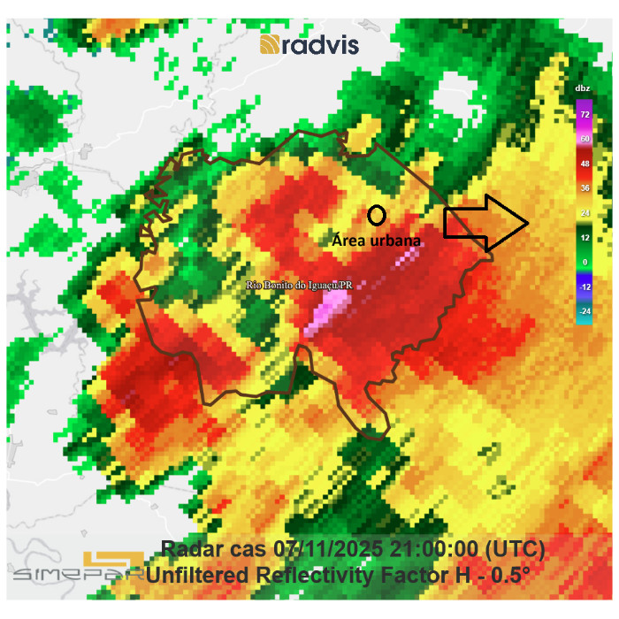 O cenário previsto foi confirmado, e o Paraná registrou intensos temporais nesta sexta-feira nos turnos da tarde e noite, num ambiente altamente instável, com grande oferta de umidade, temperaturas elevadas e queda da pressão atmosférica em superfície, além de mudança na direção e aumento da magnitude do vento com a altitude. Todos esses ingredientes foram fundamentais para formação e organização de tempestades severas com destaque para porções do oeste, centro-sul e sudoeste paranaense. Dentro dessas regiões, Rio Bonito do Iguaçu foi a cidade mais castigada em função dos fortes ventos que assolaram o município no final da tarde. Na imagem de radar em anexo é possível visualizar a supercélula que atingiu a cidade com o tornado próximo à região de gancho, o qual avançou sobre a área urbana por volta das 18h05min.