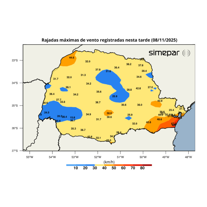 Com o gradual afastamento deste sistema da costa, a tendência é de enfraquecimento dos ventos até o início da madrugada. Entretanto, até o fim da noite, não se descarta a ocorrência de novas rajadas com intensidade elevada nas próximas horas. A maior velocidade observada nesta tarde foi de 67 km/h, na estação meteorológica de Guaratuba.