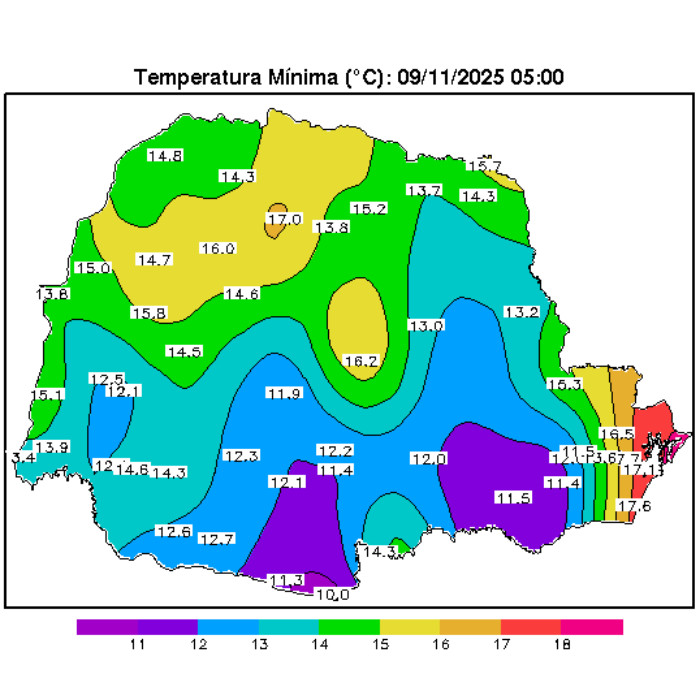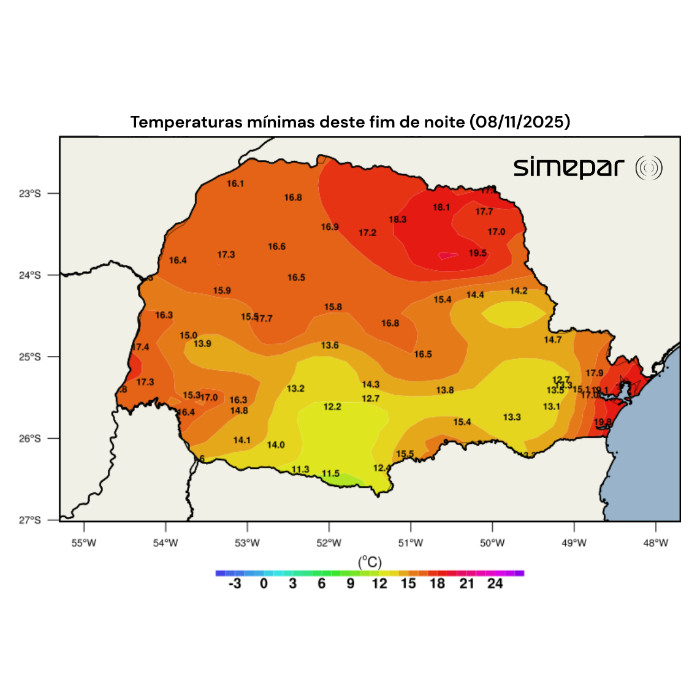 Nesta noite, o Paraná registra as menores temperaturas do período noturno em comparação aos dias anteriores desta semana, com valores abaixo dos 20,0 °C em todo o estado. Nas regiões Sudoeste, Centro-Sul, Sudeste, Campos Gerais e RMC, alguns municípios já apresentam temperaturas abaixo de 14,0 °C, sendo a menor registrada pela estação meteorológica de Palmas, com 11,5 °C. Este declínio térmico em relação às noites anteriores é consequência da passagem de um ciclone extratropical próximo à costa, que, ao se deslocar, trouxe consigo um ramo de frente fria. Na traseira deste sistema, uma massa de ar frio e seco se deslocou sobre o estado, favorecendo a queda nas temperaturas.