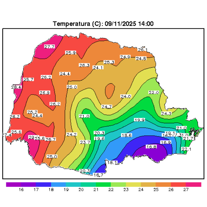 Tempestades severas seguem atuando entre o Rio Grande do Sul e Santa Catarina. No Paraná algumas pancadas de chuva atuam no Sul, próximo a região de Palmas. Faz bastante calor no Sudoeste, Oeste e Noroeste, com temperaturas acima dos 30°C. Nestes setores os ventos predominam de norte, com rajadas acima dos 50 km/h em algumas cidades. No Leste, entre a RMC e as paias, o céu continua com muitas nuvens e temperaturas mais amenas.