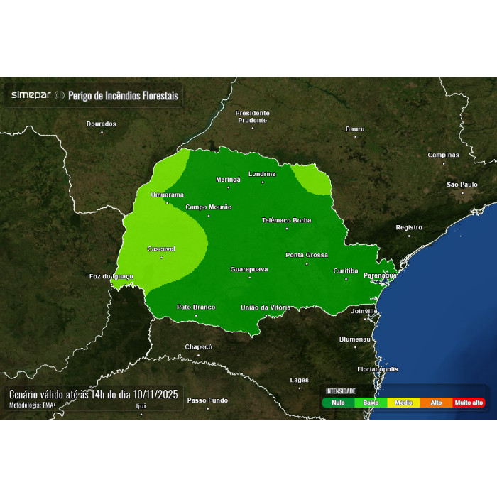 A chuva é forte no momento entre o norte da Argentina e o Rio Grande do Sul, já em função da presença do sistema de baixa pressão. No Paraná o tempo segue estável, com presença de muitas nuvens entre o Sudoeste, Centro-Sul, Campos Gerais e o Leste do estado. Na metade norte o sol predomina. Nas próximas horas o vento predominante de norte se intensifica no interior, com rajadas que devem superar os 50 km/h.