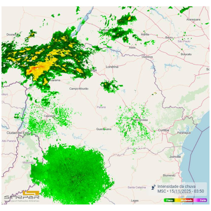 Madrugada de tempo bastante instável em parte do Paraná. Chove com intensidade fraca/moderada no setor noroeste, principalmente nos municípios mais próximos da divisa com o Mato Grasso do Sul, até mesmo com algumas trovoadas. Já nas demais regiões do estado continua com muita nebulosidade, porém apenas com garoa e/ou chuvisco ocasional (oeste e norte). As temperaturas estão um pouco mais amenas, e torno dos 15°C, entre o Centro-Sul, os Campos Gerais e a RMC.