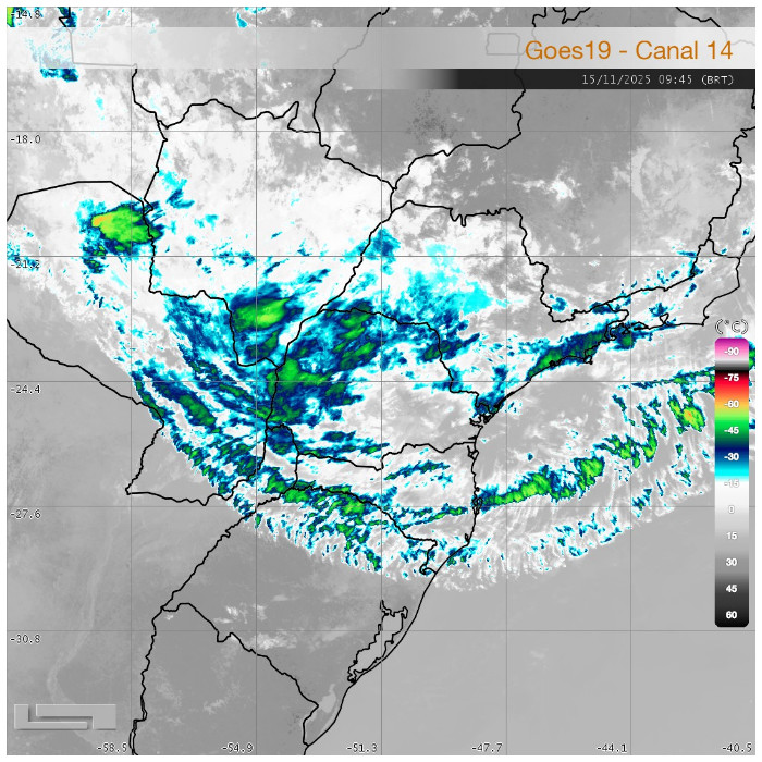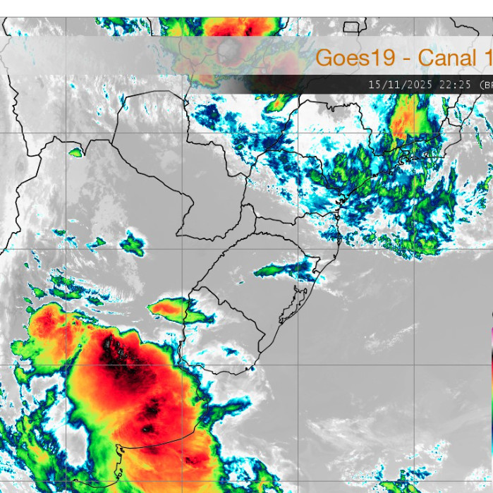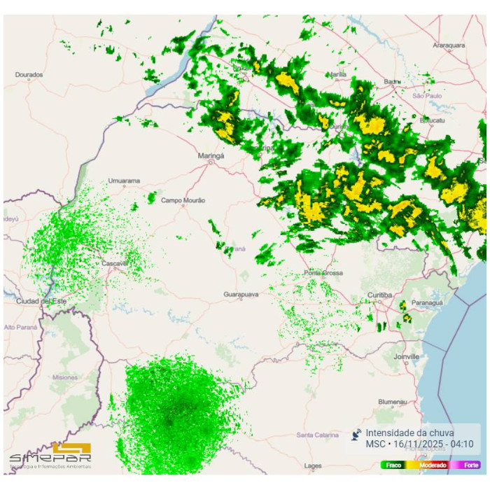 O estado do Paraná apresenta variação na cobertura de nuvens, com nebulosidade distribuída por todo o território. No momento, ocorrem pancadas de chuva pontuais nas regiões Leste, Campos Gerais e Centro-Sul. No estado do Rio Grande do Sul, observa-se a evolução de uma frente fria, que deverá avançar em direção ao Paraná ao final do dia, contribuindo para o aumento das instabilidades atmosféricas.