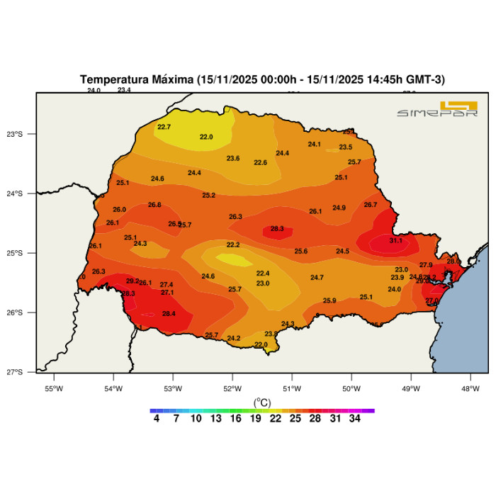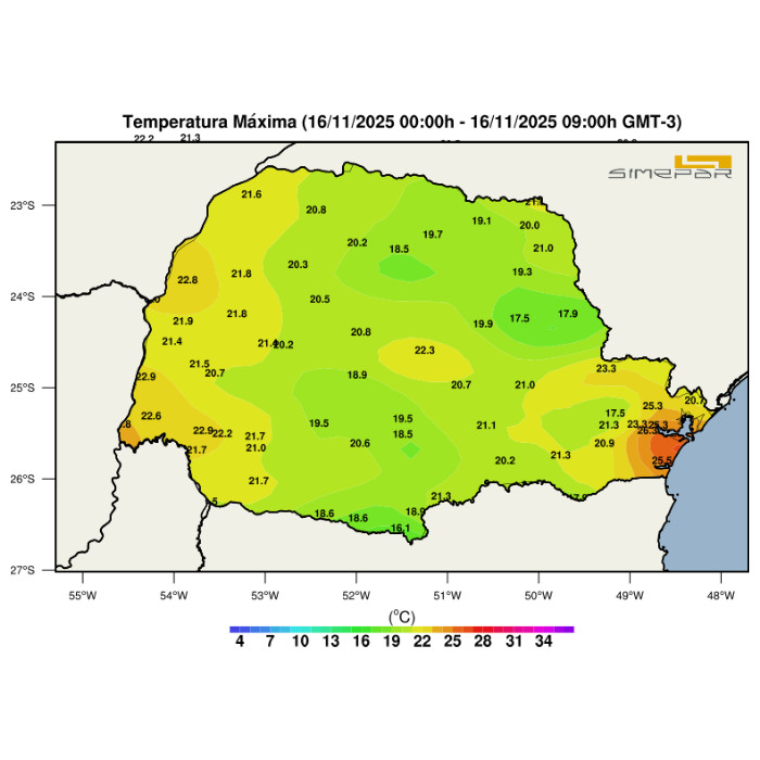 As temperaturas permanecem elevadas no Estado do Paraná, ultrapassando os 22 °C em todas as regiões. Destacam-se as regiões Centro-Sul, Oeste e Sudoeste, onde as máximas se aproximam dos 30 °C, favorecendo a ocorrência de pancadas isoladas de chuva, com possibilidade de incidência de raios. No Noroeste, as chuvas que ocorreram durante a manhã contribuíram para uma breve redução das temperaturas, com os termômetros se aproximando dos 22 °C.