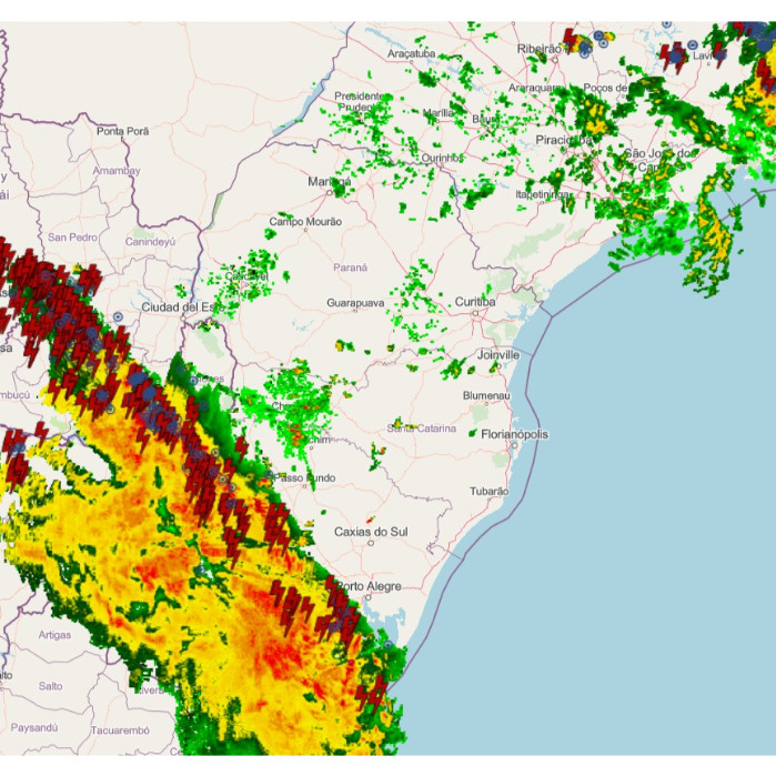 Uma frente fria avança sobre o Sul do país. No momento, o Rio Grande do Sul apresenta áreas de chuvas acompanhadas de descargas atmosféricas, além de condição para rajada de vento. Na imagem ao lado, observam-se os núcleos de precipitação com sobreposição dos registros de raios nos últimos cinco minutos, evidenciando a intensidade da instabilidade sobre o estado.