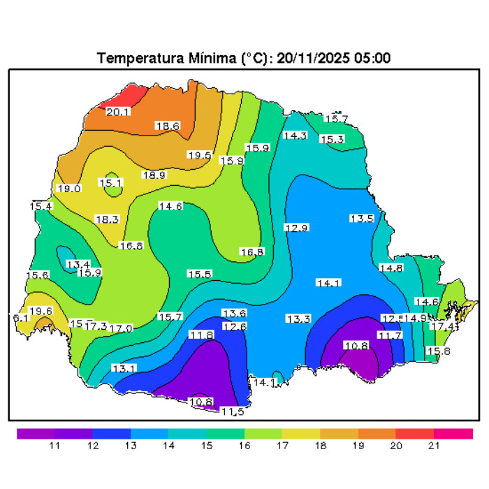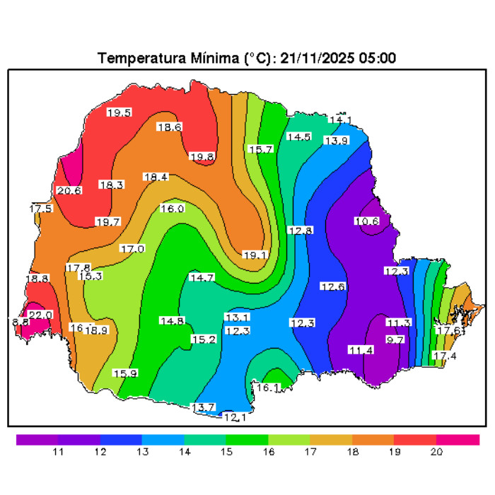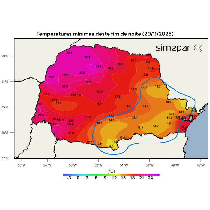 Madrugada de tempo estável no estado, com nebulosidade variável em setores do centro-sul, sudeste, Campos Gerais e faixa leste (RMC/litoral) em decorrência da circulação marítima que transporta umidade do oceano para o continente. As temperaturas mais uma vez ficaram amenas, com valores ao redor dos 15 °C, em média. Nos extremos, valores abaixo dos 10 °C em Palmas (9,2 °C), Colombo (9,2 °C) e General Carneiro (8,4 °C). No noroeste, temperaturas mais elevadas, com mínima de 19,6 °C em Loanda. No mapa a seguir é possível visualizar a distribuição de temperaturas mínimas registradas na última hora no Paraná.