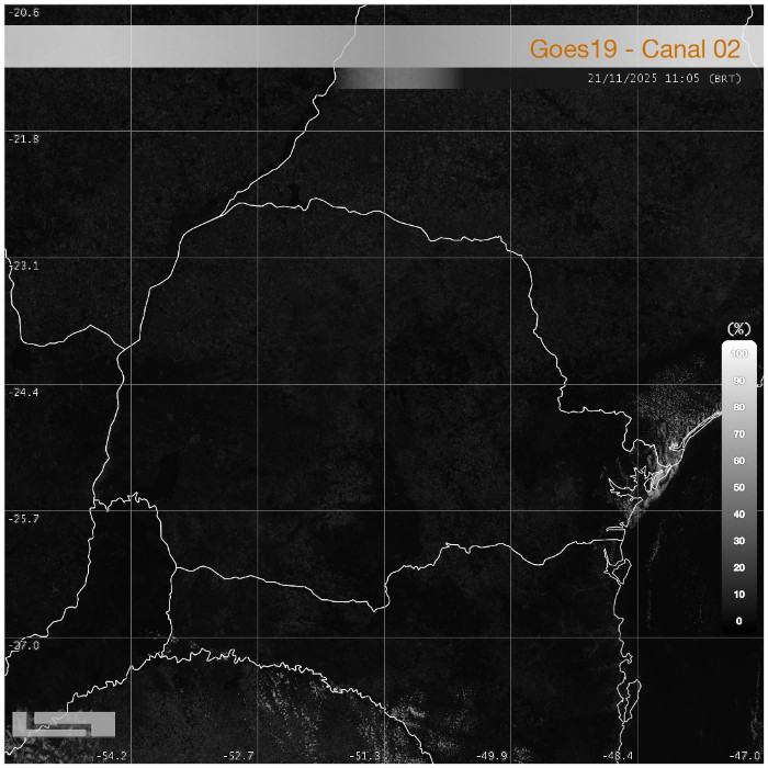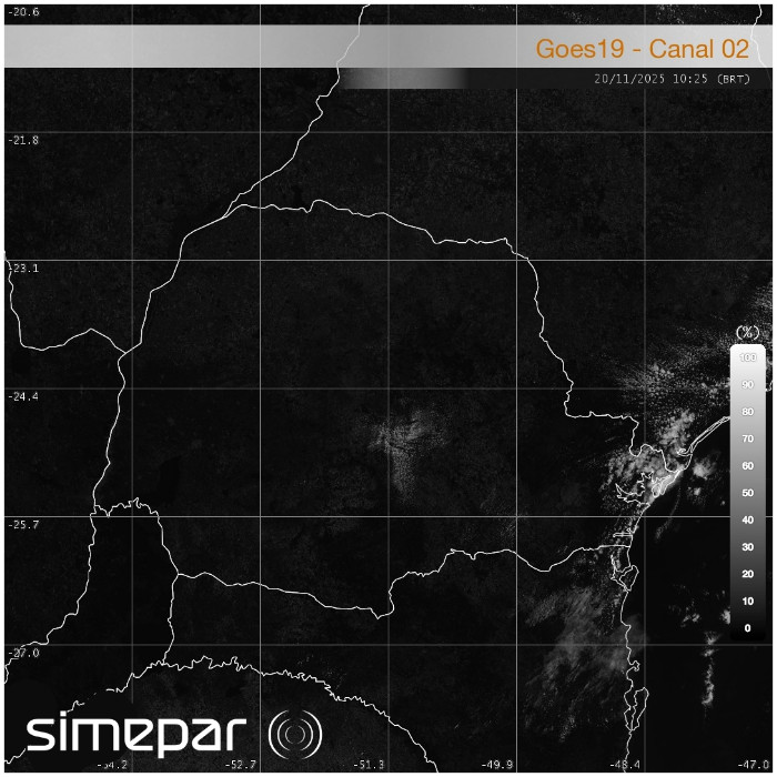 Através da imagem a seguir, observa-se o estado do Paraná conforme capturado pelo satélite GOES-19. Devido à presença de uma massa de ar seco predominante na coluna troposférica, há pouca formação de nuvens sobre o estado. Apenas uma faixa de nebulosidade baixa, representada pela coloração ciano, é visível entre os Campos Gerais, o Sudeste e a RMC. Além disso, entre o Sudoeste e o Centro-Sul, algumas nuvens de altos níveis estão presentes, embora sejam espessura. Até o final desta noite, as menores temperaturas foram registradas na RMC e no Centro-Sul, com valores em torno de 11 °C e 13 °C.