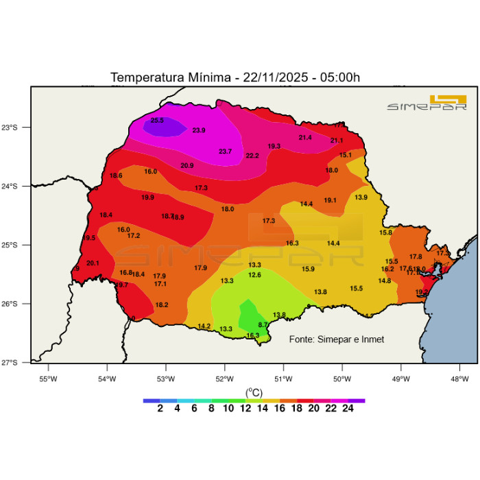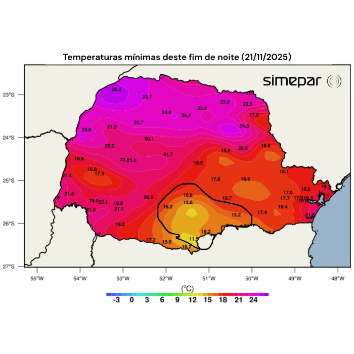 A noite no Paraná segue com tempo estável, com apenas algumas variações de nebulosidade alta, que são pouco espessas. A distribuição das temperaturas mínimas ao longo deste fim de noite pode ser observada na imagem a seguir, com dados registrados pelas estações meteorológicas do Simepar e do INMET. As menores temperaturas foram registradas nos municípios do Centro-Sul, área destacada pelo contorno em preto. Na metade norte do estado, as temperaturas mínimas estão mais elevadas, com valores superiores a 21,0 °C. Em Loanda, por exemplo, o menor registro foi de 26,3 °C.
