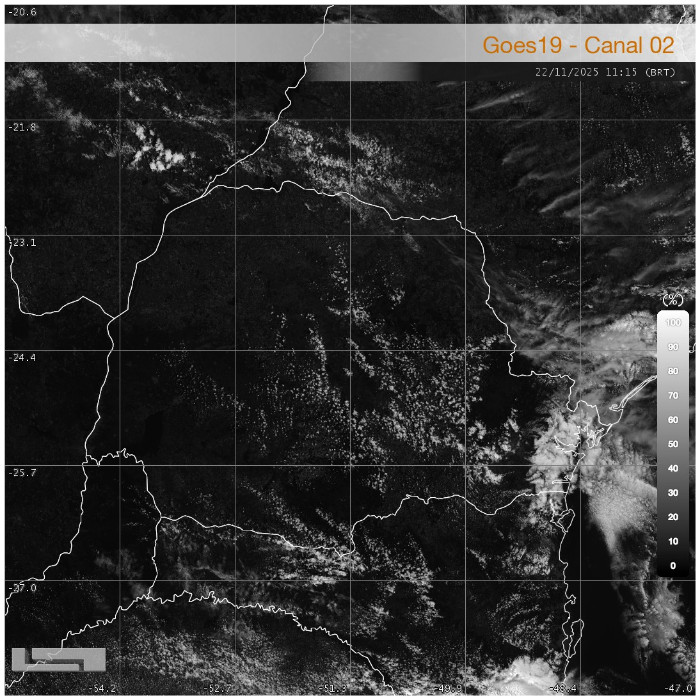 A tarde desta sexta-feira segue com predomínio de sol em todas as regiões do Paraná. Através da imagem do satélite GOES-19, é possível observar a presença de nuvens de bom tempo, do tipo Cumulus, caracterizando uma tarde ensolarada. Além disso, são apresentadas as temperaturas máximas registradas pelas estações meteorológicas do Simepar e do INMET.