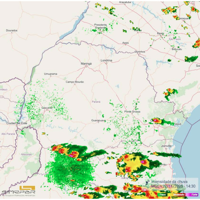 A tarde é de sol e temperatura elevada na maioria das regiões do Paraná. No entanto, algumas áreas de instabilidade pré-frontais já começaram a surgir em alguns setores do estado. No Sudoeste, bem na área de divisa com Santa Catarina, ocorrem pancadas de chuva com vários raios. Na RMC também está chovendo com um pouco mais de intensidade em alguns pontos. Nas próximas horas, a instabilidade aumenta na metade sul paranaense, porém continua com muita irregularidade nessa distribuição de chuva.
