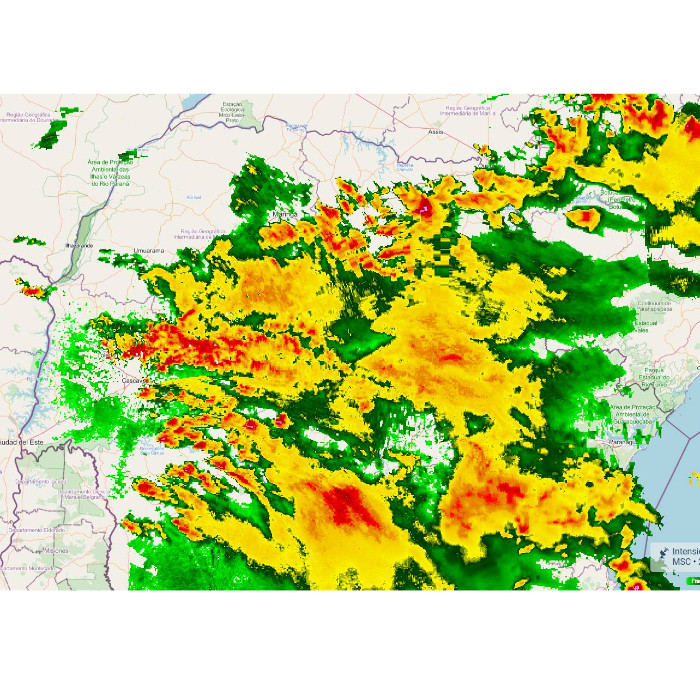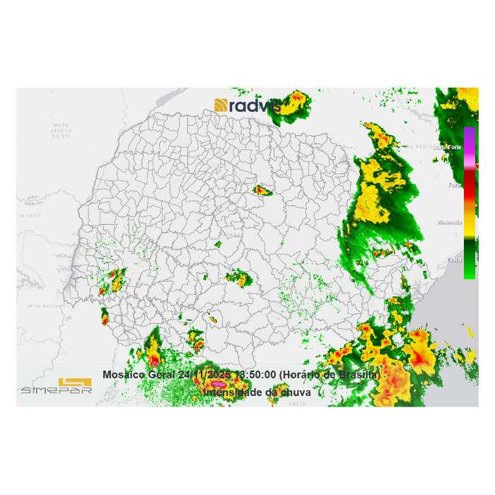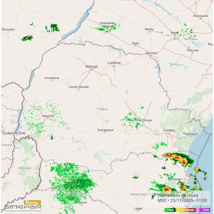 Neste início de tarde, áreas de chuva isoladas se desenvolvem de forma irregular sobre o território paranaense. Núcleos com intensidade moderada a forte estão ativos (como pode ser observado através da imagem a seguir, extraída dos radares meteorológicos do Simepar) e acompanhados de algumas descargas atmosféricas. Ao longo do período, espera-se a formação e expansão desses núcleos convectivos. No momento, também há registros de chuva na faixa litorânea.