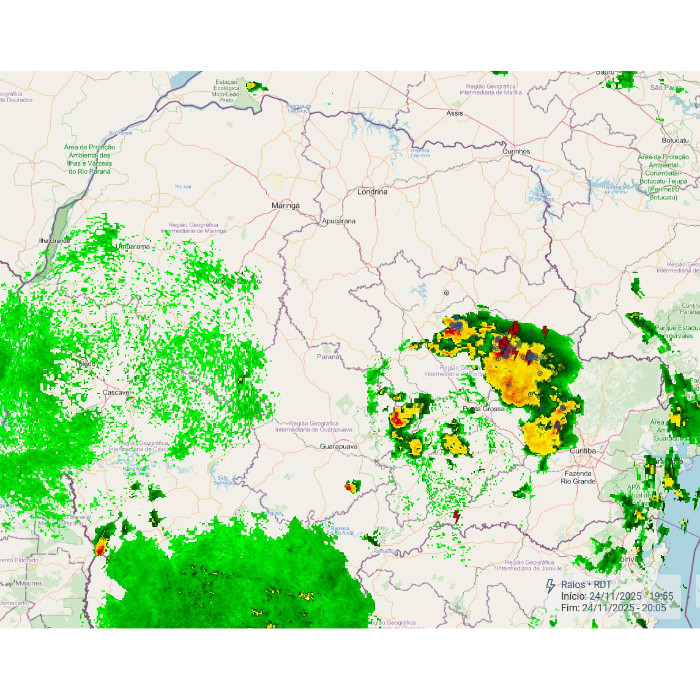 As instabilidades persistem na noite paranaense, com destaque para as regiões norte e noroeste, onde são observadas maiores incidências de descargas elétricas. Até o momento, chama atenção os volumes de precipitação registrados no litoral: 89,8 mm em Guaratuba, 76,8 mm em Matinhos, 69,6 mm em Pontal do Paraná (Praia de Leste) e 67,2 mm em Pontal do Paraná (Pontal do Sul). Além disso, acumulados superiores a 30 mm também foram registrados em localidades do interior, como Jaguariaíva, com 39,8 mm, e Cândido de Abreu, com 33,2 mm
