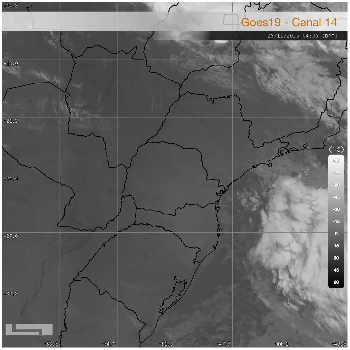 As pancadas de chuva encontram-se em processo de desintensificação. O destaque da imagem é o leste do estado, onde ainda são observadas chuvas de moderada a forte intensidade, acompanhadas de incidência de raios. Contudo, nota-se redução gradual dos eventos conforme o sistema avança. Na região litorânea, a chuva fraca deve persistir ao longo da noite desta segunda-feira. Nas demais regiões, os eventos já cessaram, com exceção do extremo sul do estado, onde ainda ocorrem pancadas isoladas.