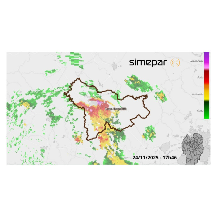 Em menos de 48 horas — entre o domingo, 23 de novembro de 2025, e o início desta tarde — a estação meteorológica do Simepar registrou cerca de 150 mm de chuva. A média histórica para o mês de novembro no município é de 220 mm, ou seja, aproximadamente dois terços do volume mensal ocorreram em menos de dois dias.