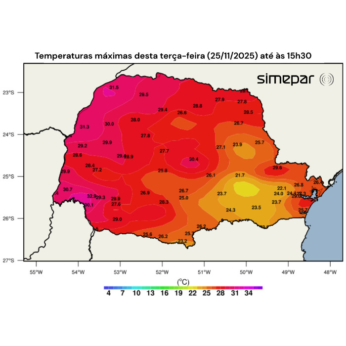 Nesta tarde, o Sol predomina sobre grande parte do Paraná, enquanto apenas no Leste do estado há maior variação de nebulosidade. Em todo o território paranaense, as temperaturas máximas registradas até às 15h30 ultrapassaram os 23,0 °C. Na faixa oeste, onde se concentram os valores mais elevados, destacam-se as estações meteorológicas de Capanema e Loanda, que registraram 32,9 °C e 31,5 °C, respectivamente.