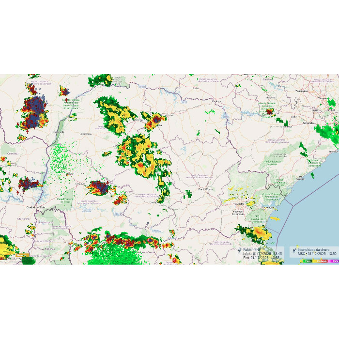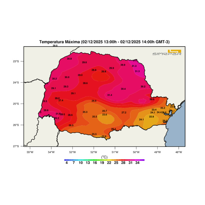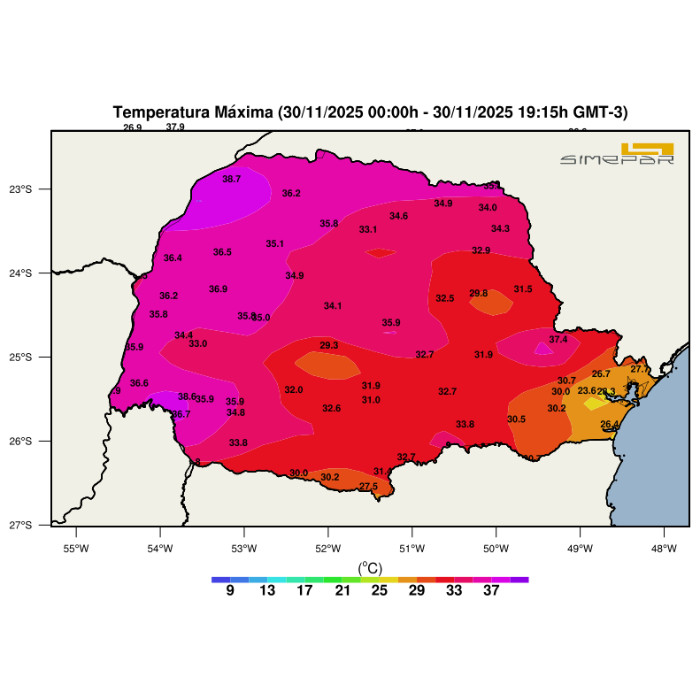 As temperaturas permanecem elevadas em todo o estado, com destaque para o oeste paranaense, onde algumas estações registraram valores acima de 38 °C, como em Loanda e Capanema. No leste, o calor atuou como combustível para a formação de instabilidades, resultando em precipitações intensas típicas da primavera, com volumes próximos de 10 mm em um intervalo de apenas 15 minutos em diversas estações.