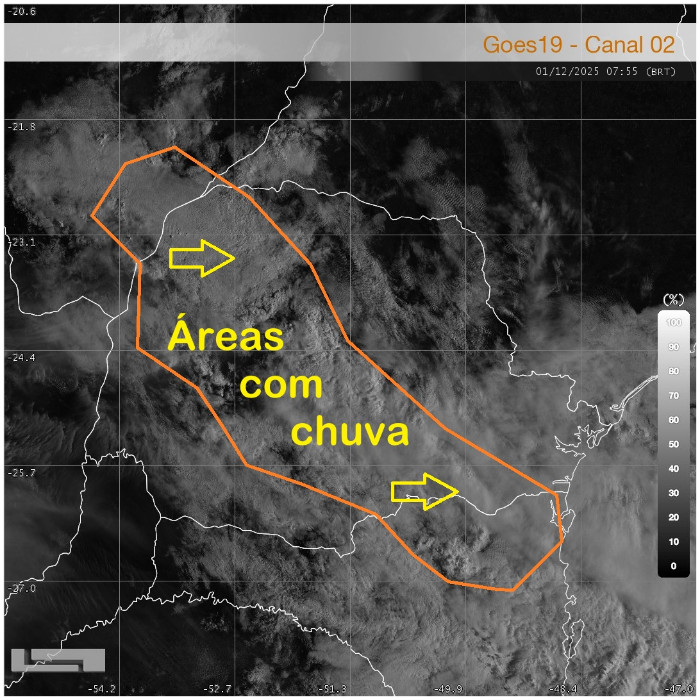 Nesta madrugada, a nebulosidade baixa predominou no Leste, em partes do Sudeste Paranaense e nos Campos Gerais. Entre a RMC e o Litoral, inclusive, houve registro de precipitação fraca e ocasional. Nas demais áreas do estado, o céu permaneceu aberto. Na imagem a seguir, extraída do satélite GOES-19, observa-se a cobertura de nuvens sobre o território paranaense.