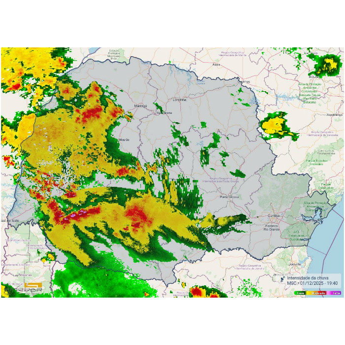 Nesta madrugada, as pancadas de chuva isoladas ainda ocorrem nas metades oeste e sul, porém com redução da intensidade. Núcleos moderados e com maior frequência de raios, concentram-se em municípios do Centro-Sul, próximos à divisa com Santa Catarina, área destacada pela elipse em preto.
