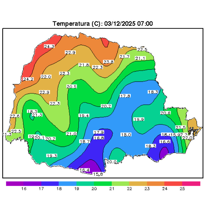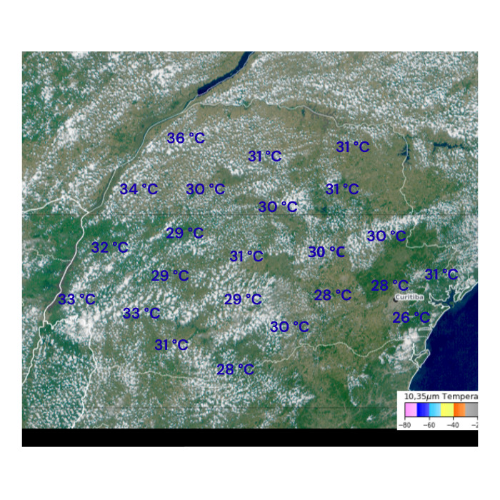 A noite desta quinta-feira apresenta condições de estabilidade atmosférica em todo o território paranaense, sendo observado baixa cobertura de nuvens e declínio gradual das temperaturas. No momento, as temperaturas na região leste do estado variam entre 17 °C e 24 °C, enquanto o setor oeste registra valores entre 24 °C e 29 °C.