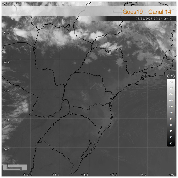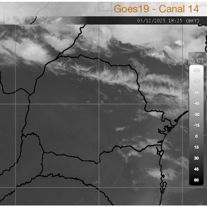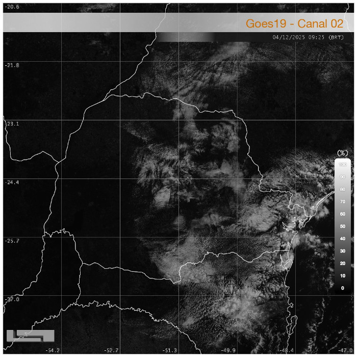 Nesta quinta-feira, o dia começa com o céu bastante encoberto, especialmente nas regiões Leste e Central do estado. No momento, as temperaturas médias mais elevadas são registradas no Noroeste, onde os termômetros marcam cerca de 25 °C. Já nas regiões Centro-Sul e Leste, os valores permanecem mais amenos, em torno dos 17 °C. A imagem de satélite mostra a presença de ampla nebulosidade sobre a faixa Leste do estado.