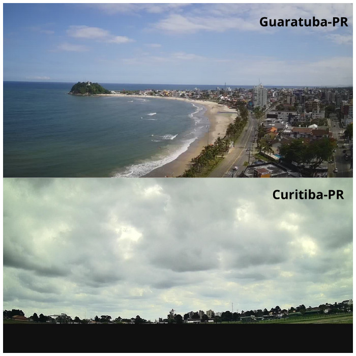 Na imagem a seguir, extraída das câmeras de vigilância, observa-se o contraste de nebulosidade presente no céu do Litoral Paranaense e do céu da capital do estado.