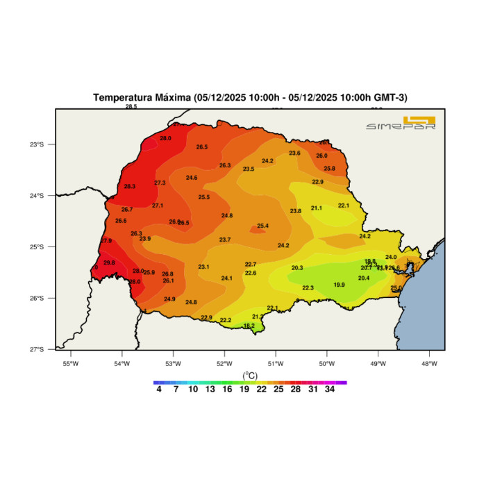 Através da primeira imagem a seguir, extraída do satélite GOES-19, observa-se o predomínio de sol em todo o Paraná. No interior do estado há apenas maior variação de nuvens do tipo Cumulus, mas, de modo geral, a tarde segue com presença marcante de sol. As temperaturas máximas registradas pelas estações meteorológicas do Simepar e do INMET até às 15h estão distribuídas na própria imagem de satélite. Nota-se um aquecimento expressivo, com valores de pelo menos 28 °C em praticamente em todo o estado. No Noroeste, o termômetro no município de Loanda já registrou 36 °C.