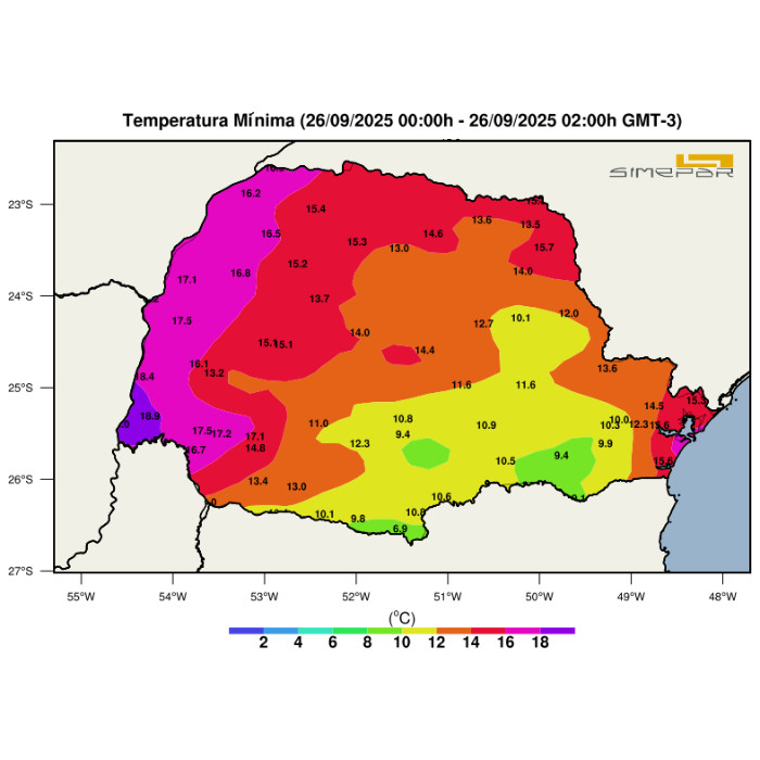 Nebulosidade no Paraná, é mais presente em parte do leste, possibilitando algum chuvisco ocasional, especialmente em pontos da Serra do Mar. As temperaturas estão mais elevadas a partir da faixa oeste, com média de 17 °C, enquanto o setor sul do Estado, volta a registrar valores próximos dos 7 °C.