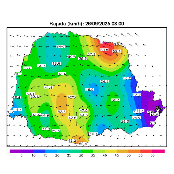 Os maiores acumulados até o momento foram registrados no oeste e sudoeste do estado, com destaque para São Miguel do Iguaçu (21 mm). As instabilidades seguem avançando, de forma irregular e menos organizada, em direção ao centro, norte e leste do estado. As chuvas tendem a ocorrer com fraca a moderada intensidade com rajadas de vento e trovoadas esparsas. Chuvas fortes de forma bastante pontual não estão descartadas. Temporais localizados devem voltar a atingir a metade oeste nas próximas horas.