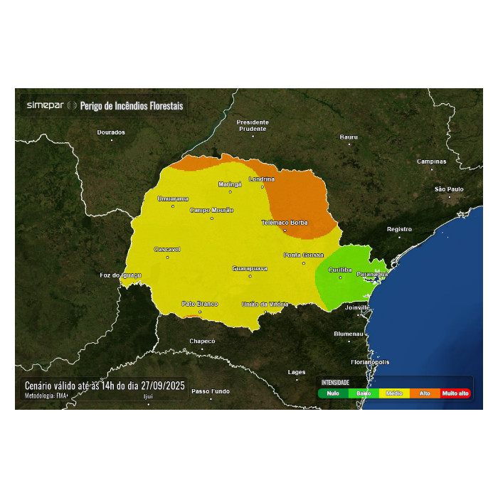 Na segunda imagem, o risco para incêndios florestais no Paraná, válido para as próximas 24h. Destaque para risco alto em grande parte do Norte Pioneiro e áreas de divisa com SP.