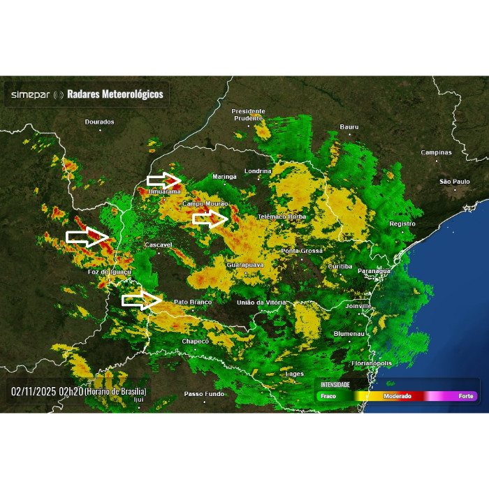 Segue com chuva no Paraná, especialmente a partir das regiões oeste e sudoeste, estendendo-se também para porções centrais do estado. No momento, uma faixa central concentra maior nebulosidade e ocorrência de chuvas, acompanhadas de alguns raios.
