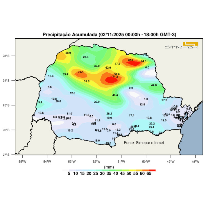 No decorrer deste domingo, áreas de instabilidades atuaram nas regiões paranaenses com pancadas de chuvas acompanhadas de muitas descargas elétricas e rajadas de ventos moderados a fortes. Entre a madrugada e a manhã, os acumulados passaram dos 70 mm nas regiões do norte do estado, já as rajadas vento, alcançaram 92 km no Norte Pioneiro. Neste final de tarde, novas áreas de instabilidades avançam do Paraguai e Mato Grosso do Sul, em direção as regiões oeste e noroeste com pancadas de chuvas acompanhadas de descargas elétricas. O mapa mostra os acumulados de chuvas registrados neste domingo até às 18h pelas redes de estações meteorológicas do Simepar e Inmet.