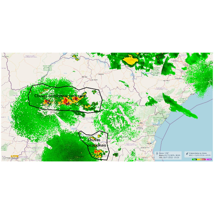 Tempo instável entre o Paraná e São Paulo, com ocorrência de chuvas em várias áreas, além de registros de chuva com raios também no Mato Grosso do Sul, próximo à divisa com o Paraná. Na imagem ao lado, que apresenta os dados de radar meteorológico, observa-se a distribuição das áreas de precipitação entre essas regiões no momento.